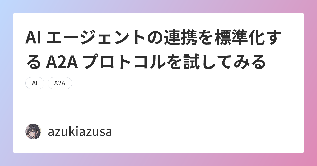 この記事ではサンプルコードを通じて A2A プロトコルを実際に体験してみます。すべてのコードは以下のレポジトリに公開しています。