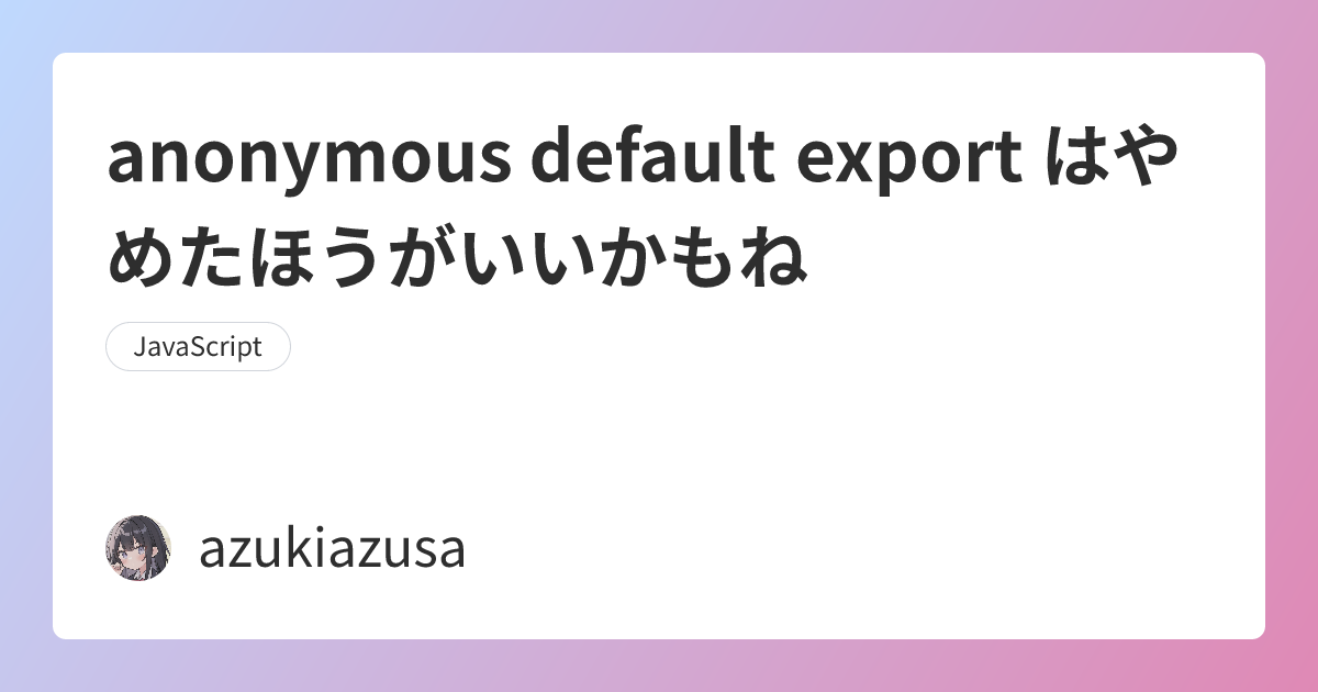 `anonymous default export` とは名前の通り匿名でデフォルトエクスポートを宣言することです。必ず名前を付与しなければいけない名前付きエクスポートと異なり、以下はすべて有効な構文です。