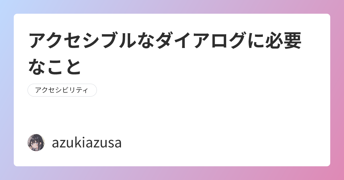 どのモーダルが表示されているか支援技術に伝えるために、ダイアログにラベルを付与する必要があります。ダイアログにタイトルが表示されている場合には aria-labbeledby 属性を使用してダイアログにラベルを付けることができます。ダイアログにタイトルが存在しない場合には aria-label 属性を使用してラベル付けします。