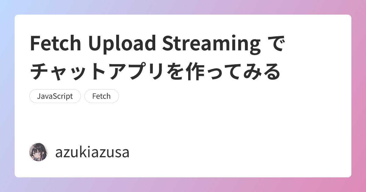 });かねてより Fetch API ではレスポンスを ReadableStream で取得できたのですが、反対にリクエスト時に body に Stream データを渡すことはできませんでした。Chrome 105 から有効となります。Fetch Upload Streaming を使用すれば、WebSocket のようなリアルタイムなデータのやり取りも Fetch API だけで可能となります。今回は Fetch API を利用してリアルタイムなチャットアプリを作成してみます。