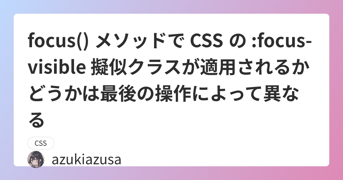 :focus-visible 擬似クラスはユーザーの入力方法によって異なるフォーカス表示をしたい時に便利です。この擬似クラスはキーボード操作によりフォーカスされた場合に適用されますが、マウス操作によりフォーカスした場合には適用されません。 それでは、JavaScript の focus()メソッドによりフォーカスされた場合には、`:focus-visible` 擬似クラスは適用されるのでしょうか?実はこれは最後 `focus()` メソッドが呼ばれる前に要素にフォーカスがあったかどうかにより異なります。