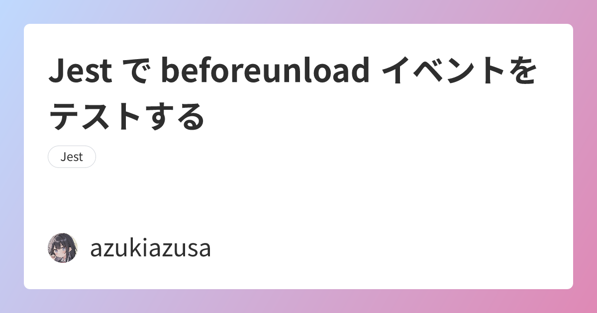 window.dispatchEvent(new Event('beforeunlaod'));さらに確認ダイアログが表示されるかどうかは preventDefault() が呼び出されているかどうかで確認できるので、モック関数を仕込んで渡すこで検査できます。