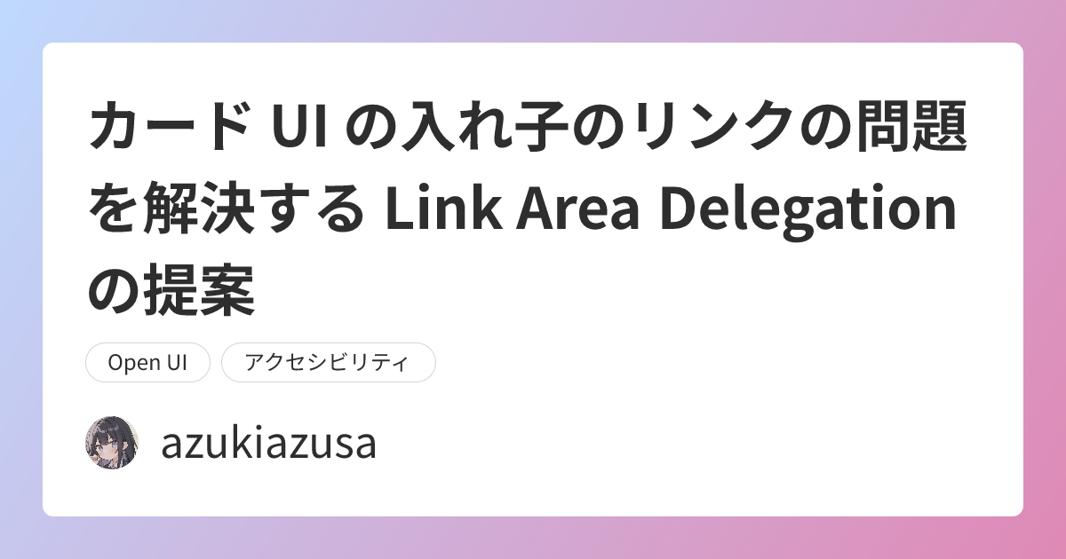 多くのウェブサイトではリンクを入れ子にしたカード UI が利用されています。しかし、このような UI では HTML 仕様に違反していたり、ハッキーな手法で実装されていることがあります。Open UI コミュニティでは Link Area Delegation という提案を行っており、標準化された方法で入れ子のリンクを実装することで UX やアクセシビリティを損なうことを防ぐことを目的としています。この記事では Link Area Delegation の内容について紹介します。