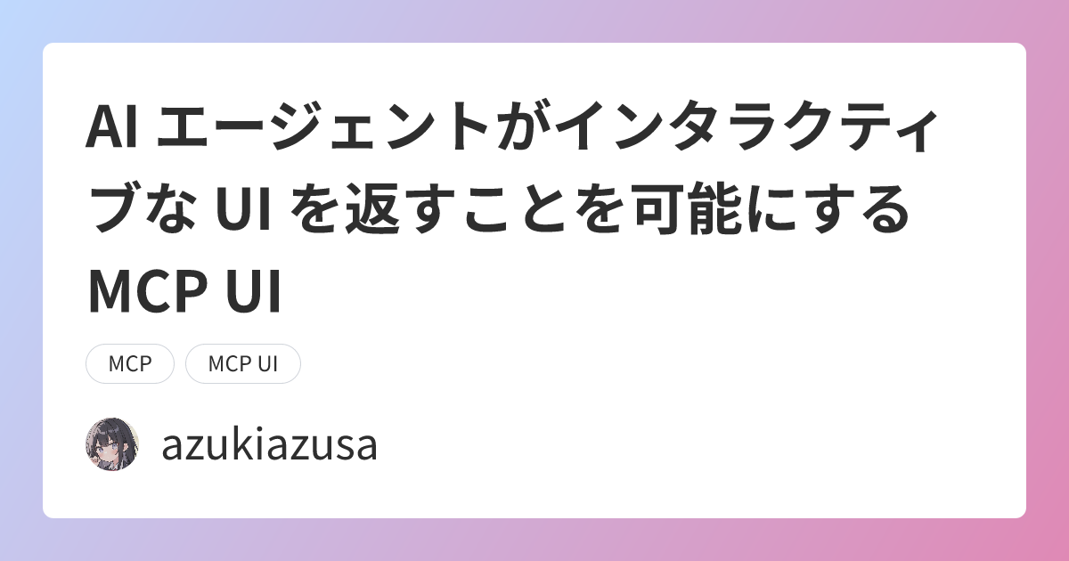 - MCP UI は Model Context Protocol (MCP) を拡張して、AI エージェントがインタラクティブな UI コンポーネントを返すことを可能にする