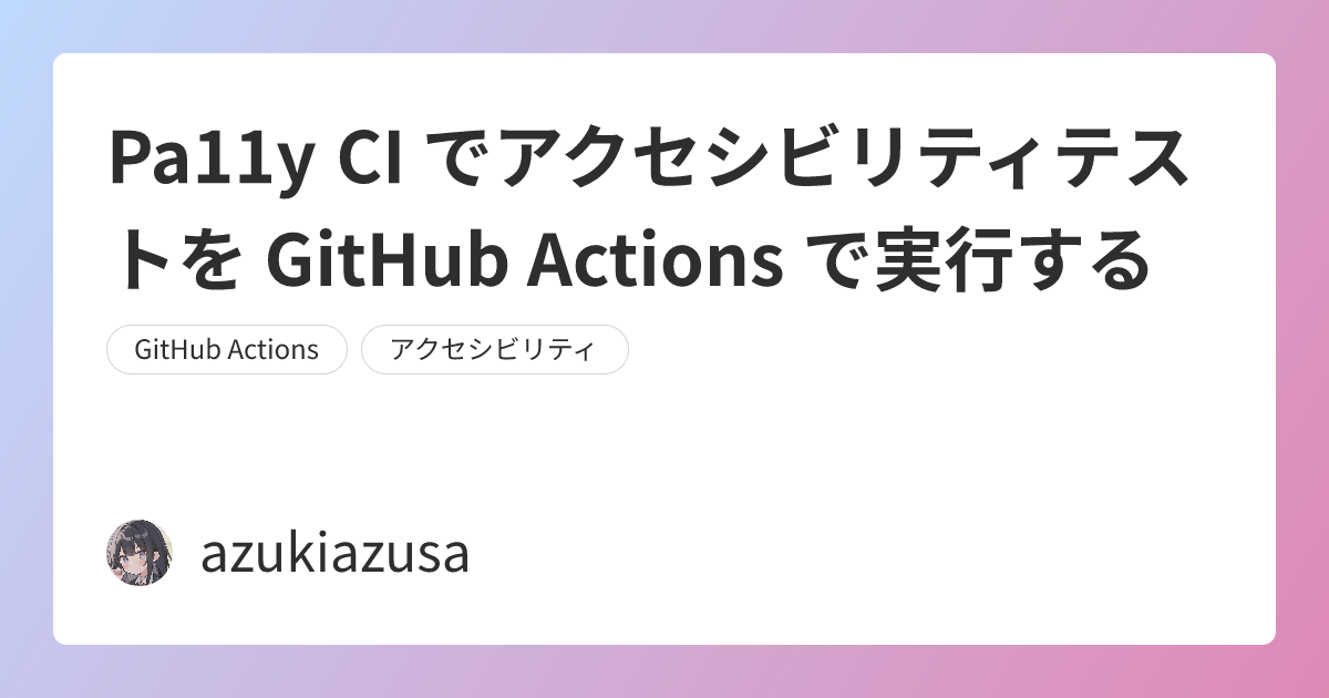ローカルで pa11y-ci の実行が確認できたので、それでは実際に CI 上で実行してみましょう。ここではコードを変更したときにアクセシビリティに違反していないかどうか PR で確認できるように GitHub Actions で実行する例を考えてみます。