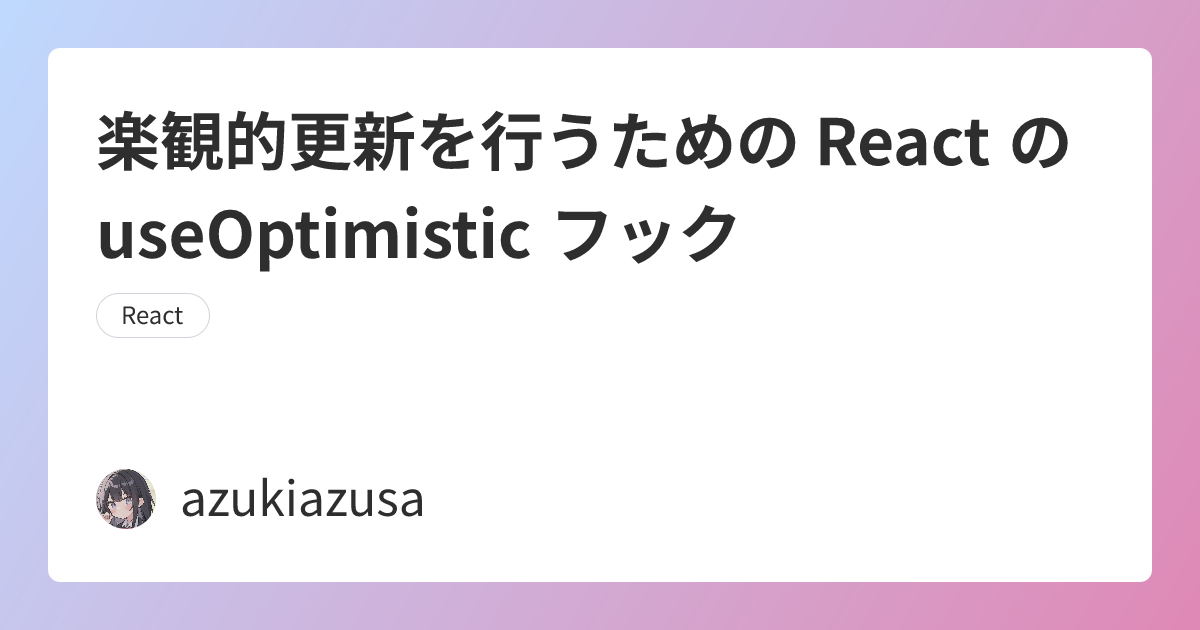 React v19 では楽観的更新を行うための useOptimistic フックが導入される予定です。楽観的更新とは、ユーザーの操作に対して非同期処理の完了を待たずに UI を更新する手法のことです。楽観的更新によりユーザーの操作に対して即座にフィードバックを提供できるため、UX の向上につながります。