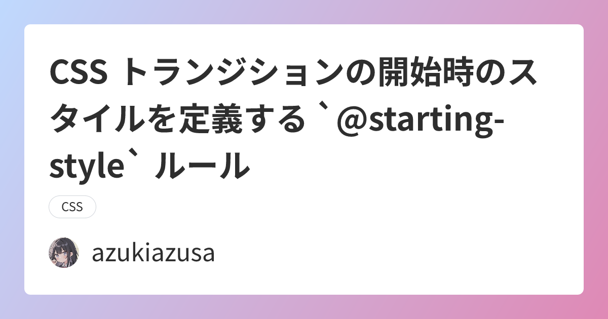 `@starting-style` ルールは、CSS トランジションの開始時のスタイルを定義するためのアットルールです。CSS トランジションの既定のルールでは前回のスタイル変更イベントでレンダリングされていなかった要素では、アニメーションが適用されない、`display: none` から他の値に変更した場合にアニメーションが適用されないといった問題があります。`@starting-style` ルールを使用することでこれらの問題を解決できます。