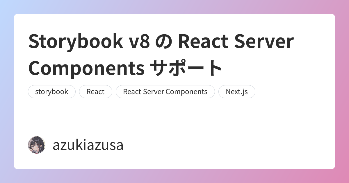 Storybook v8 より、experimentalNextRSC というオプションが追加されました。このオプションは true に設定することで、実験的に React Server Components をサポートします。