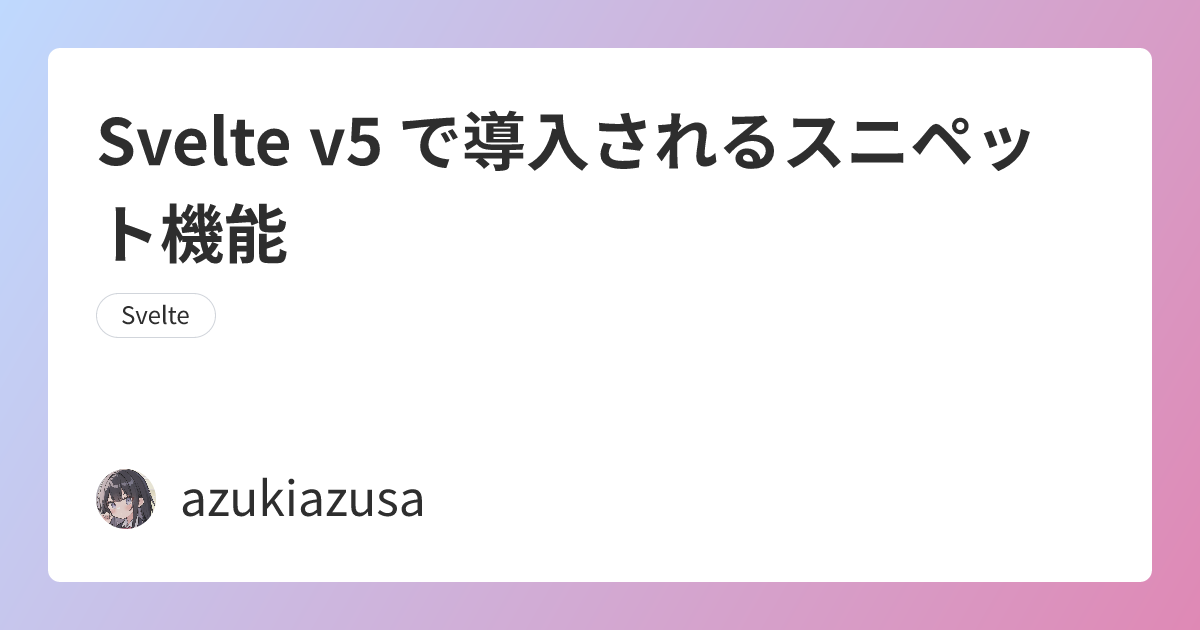 Svelte v5 ではスニペットと呼ばれる新しい機能が導入されます。スニペットとは、コンポーネント内で使用できる再利用可能なマークアップのことです。#snippet ディレクティブを使用してスニペットを定義し、引数を受け取ることができます。スニペットを呼び出す際には @render ディレクティブを使用します。