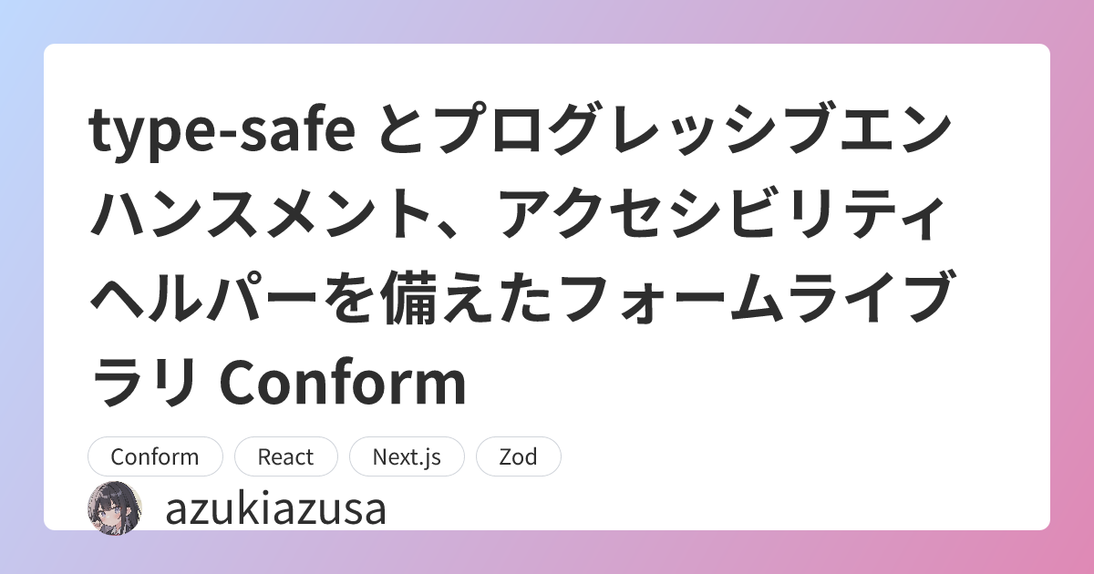 Conform は React 向けのフォームライブラリです。type-safe であること、Web 標準を利用したプログレッシブエンハンスメントや、アクセシビリティヘルパーを特徴としており、Next.js の Server Actions や Remix に対応しています。