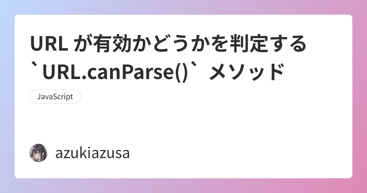 `URL.canParse()` メソッドは与えられた URL 文字列が有効であるかどうかを判定します。URL 文字列が有効であれば `true` を、無効であれば `false` を返します。これは URL コンストラクターを用いた `try...catch` 文による判定よりも簡潔に記述できます。