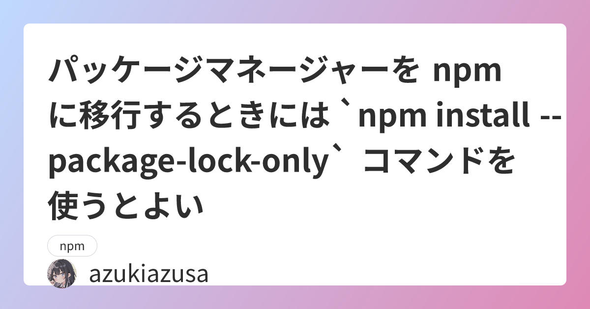 既存のプロジェクトで npm に移行する際に `npm install --package-lock-only` を使うことで、依存パッケージのバージョンを変更することなく lock ファイルを移行できます。