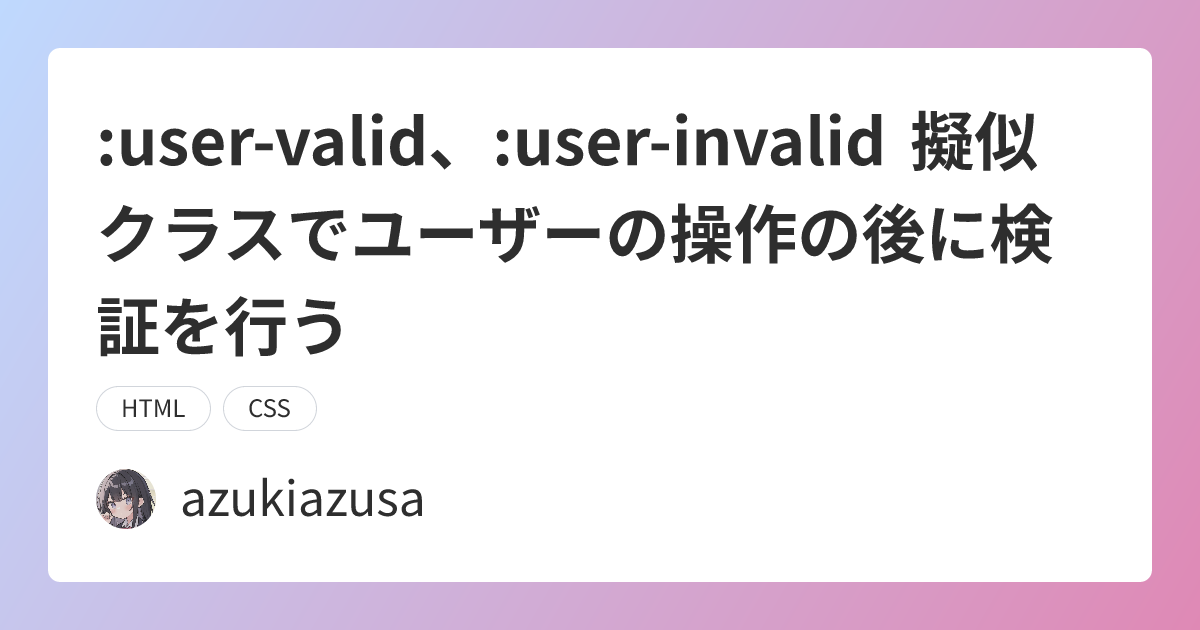 :user-valid、:user-invalid擬似クラスはユーザーの操作の後にフォームの検証に基づき有効か無効かを示すために使用できる:user-valid、:user-invalid擬似クラスは:valid、:invalid擬似クラスと異なり、ユーザーがフォームに入力するまではスタイルを適用されない:user-valid、:user-invalid擬似クラスは JavaScript を用いずに、適切なタイミングでエラーを示すスタイルを適用するために有益:has擬似クラスと組み合わせることで、JavaScript を用いずにエラー文言を出し分けることができる